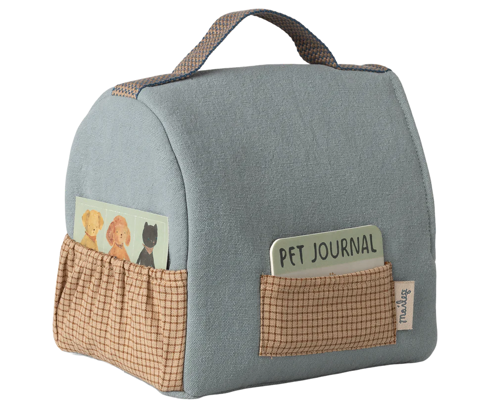 Deze stoffen draagmand is speciaal gemaakt voor de kleine puppy's van Maileg. De carrier heeft een handig handvat en wordt geleverd met een dierenpaspoortje. De draagmand is 17 cm hoog en wordt geleverd zonder de puppy op de afbeelding.