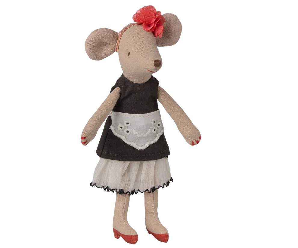 Deze Maileg moeder muis doet niets liever dan mooie kleren aantrekken en zich mooi opmaken. Een echte styliste. Ze draagt een jurk, hakschoentjes en een prachtige strik. Haar nagels zijn gelakt en haar lippen gestift.