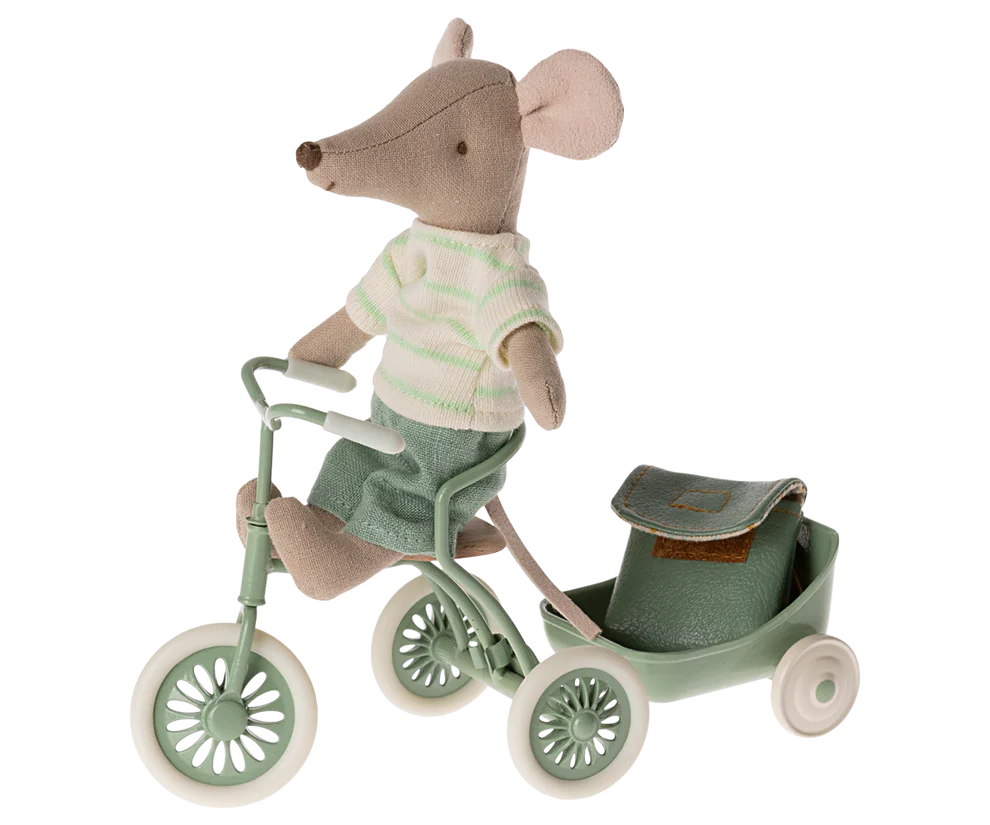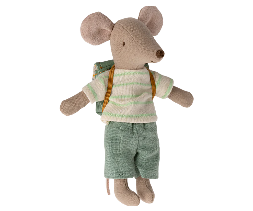 Deze grote broer muis is er klaar voor om naar school te gaan! Met zijn schooltas stapt hij het liefste op zijn driewieler. De handjes bevatten magneetjes, zodat hij zelf zijn rugzak vast kan houden.