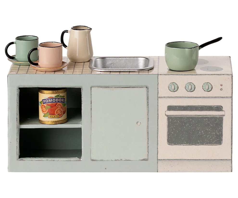 Deze kleine Maileg keuken is gemaakt van karton en past perfect in bijvoorbeed de SuitCasa koffer. De keuken bevat een metalen gootsteen en wordt geleverd met keukengerei.