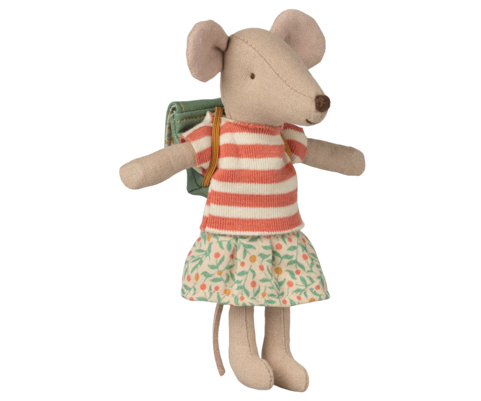 Met deze Maileg kleding set kleed je je grote zus muis mooi aan. Deze kleding set bestaat uit een gestreept shirt, een rok en een rugtas.