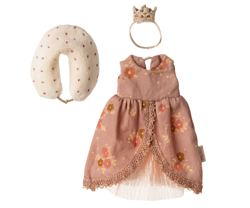 Kleed je Maileg moeder muis om tot een echte koningin met deze prachtig ontworpen koninklijke jurk. Deze jurk is gedetailleerd afgewerkt, is compleet met een luxe kraag en het bijpassende kroontje en gemaakt van katoen/polyester.