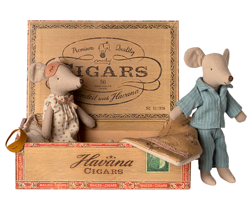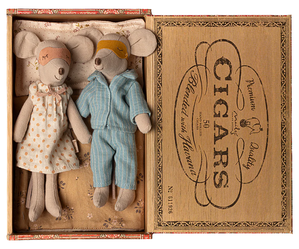 Maak je muizen familie compleet met de Maileg vader en moeder muis in slaapkleding. Vader en moeder slapen in een prachtige sigarendoos met hierin een matrasje, dekentje en kussentjes. Lekker comfortabel. Maileg vader en moeder zijn 17 cm hoog.