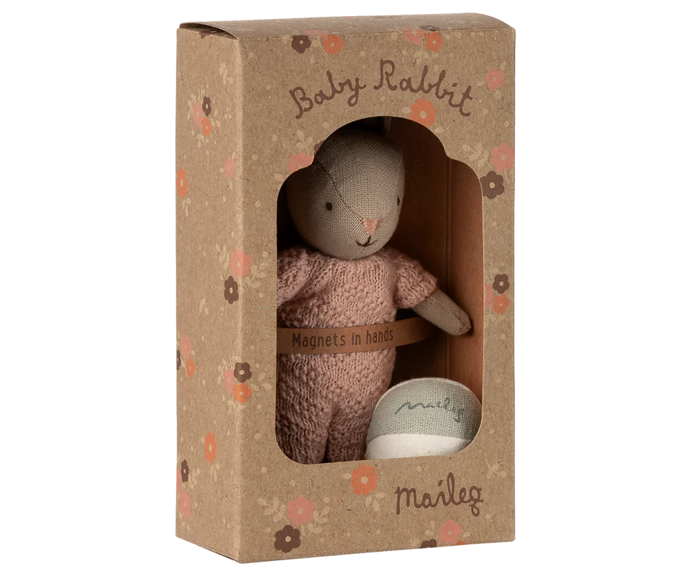 Deze leuke set bevat een lief Maileg konijntje met warm gebreid pakje en magneethandjes en een bal. Het konijntje is 11 cm hoog.