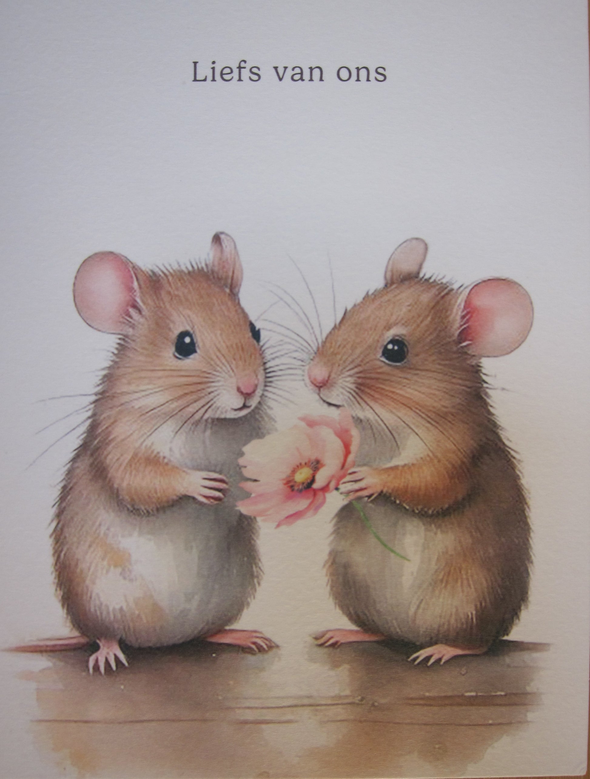 Vierkante kaart met twee muisjes. De kaart is 16 x 16 cm. Compleet met envelop.